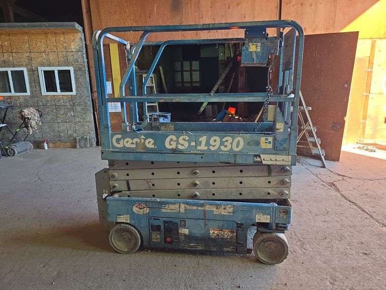LOT 1 - GENIE GS-1930 SCISSOR LIFT. BATTERIES NOT THAT OLD. OPERATES AS IT SHOULD.